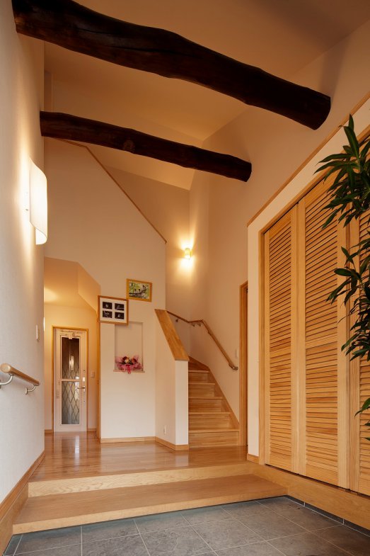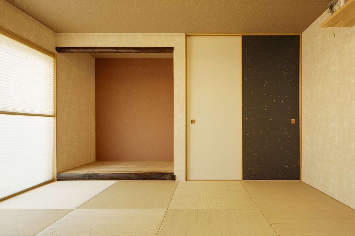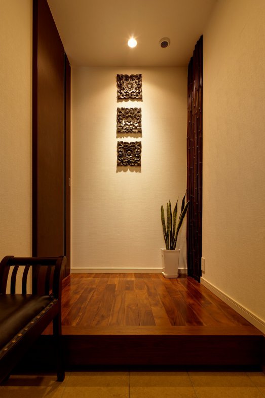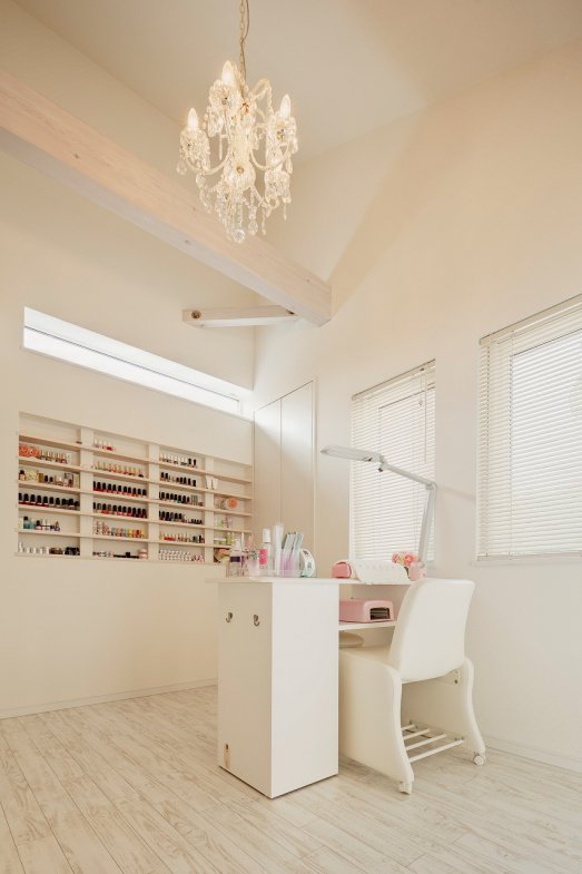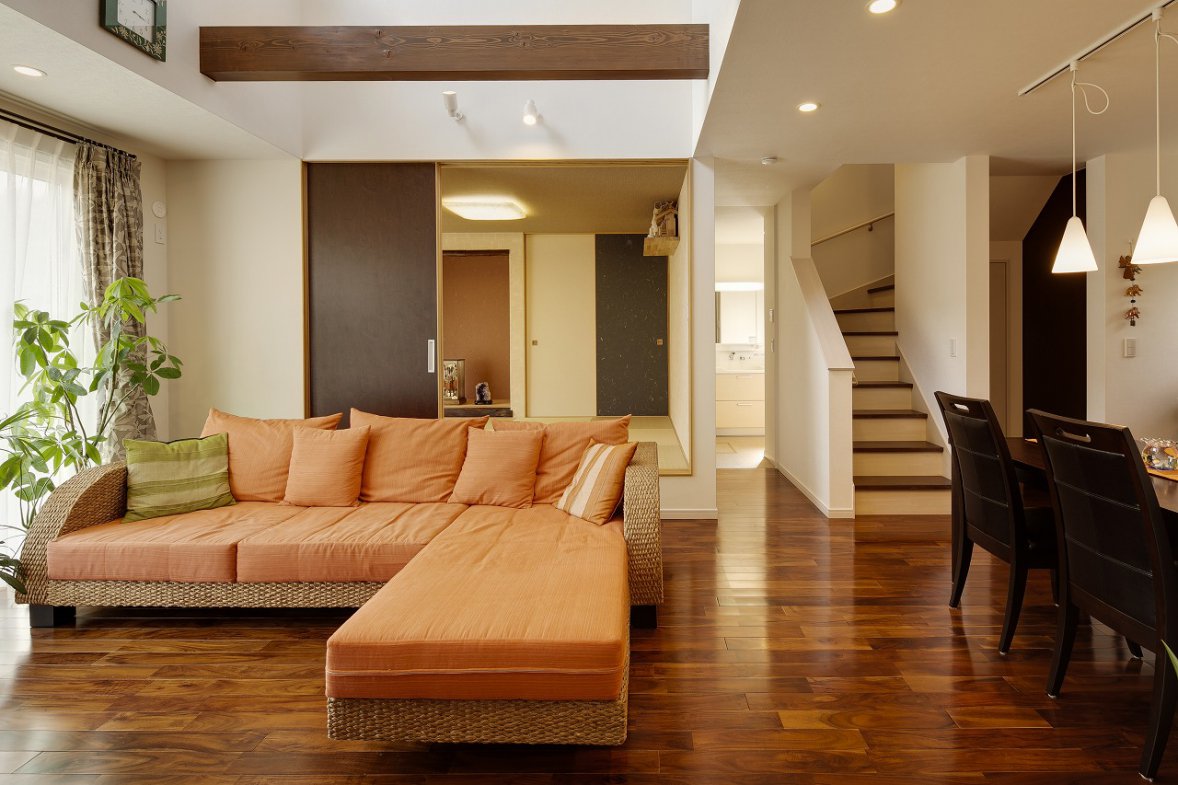 奥様の趣味であるネイルサロンのスペースも考慮し、間取りを設計。玄関は分けつつも室内で行き来ができる動線を確保し、入ると大空間の吹抜けと畳コーナーが広がります。