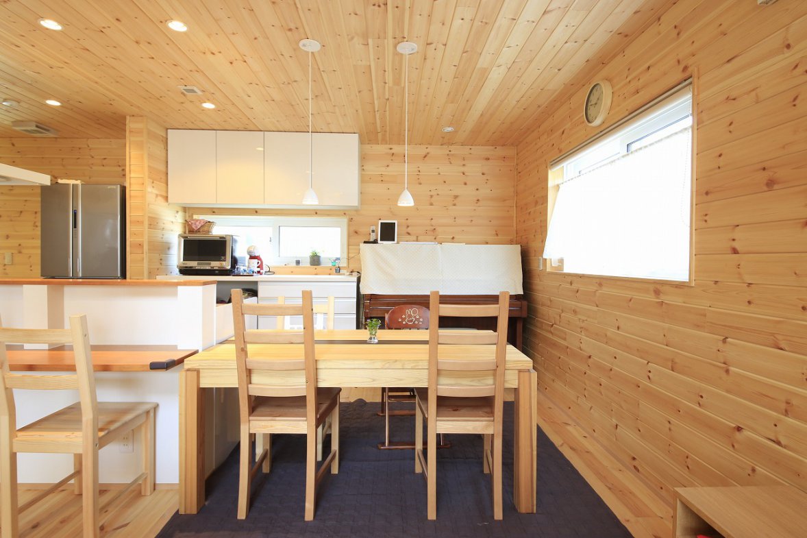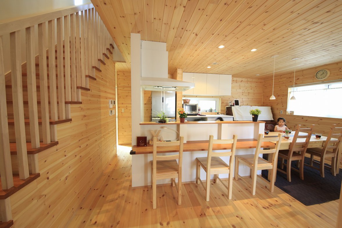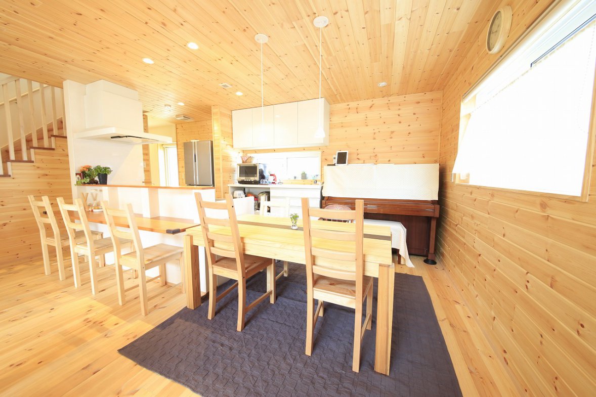 アウトドア派のご主人の希望で、ログハウスをイメージしたこだわりの住まいが完成しました。リビングはご主人のイメージをもとに設計され、当初は部分的に張る予定だったパイン材も、思い切って全面に張ることに変更。「絶対貼ってよかった」とご夫婦から喜びの声をいただきました。予算との兼ね合いもありましたが、譲れないこだわりはしっかり守ったことで満足のいく仕上がりとなっています。リビングの雰囲気に合わせ、壁紙や照明は奥様が全て選定しました。