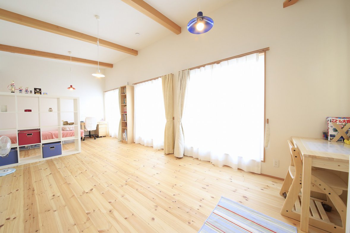 間取りについては、リビングの吹抜け部分を将来的に子供部屋にできる設計に。ただ、現状の開放感ある雰囲気を気に入っているため、実際に間仕切りを行わない可能性もあります。子供部屋は将来三つに分けられる間取りで、2階全体は子供たちが走り回れる回遊空間として計画されており、家族みんなが快適に暮らせる工夫が随所に詰まっています。