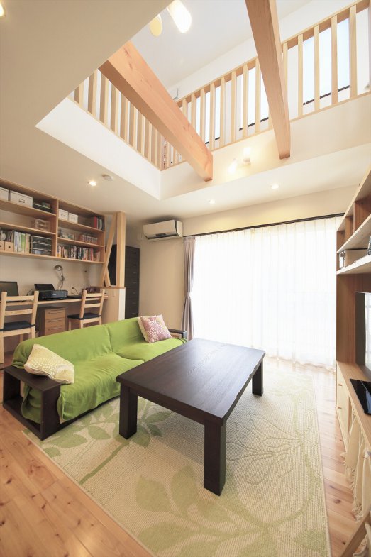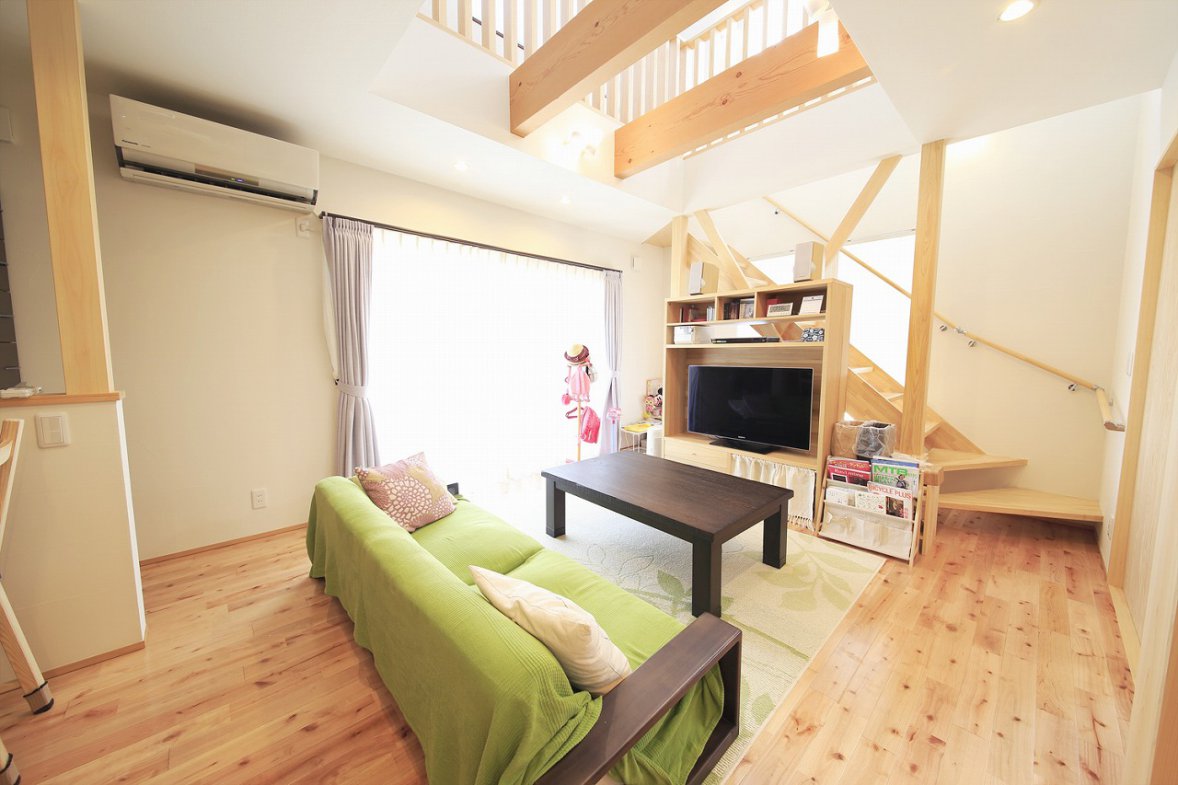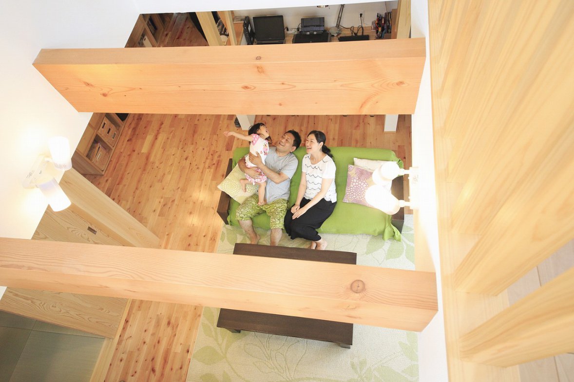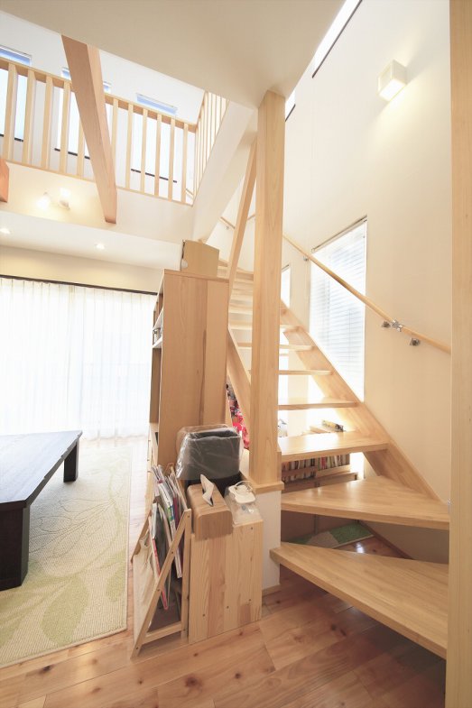 M様邸は、和風モダンの落ち着いた外観が特徴です。白い塗り壁に木調の外壁をアクセントとして取り入れ、温もりを感じられるデザインに仕上げています。南側に面した大きな窓と吹き抜けからは、一日中光が降り注ぐ明るいリビングが広がります。吹き抜けを設けることで、大きな梁の存在感や木製の手すりの温もりを感じられる空間に。床はカバザクラの無垢材、壁は珪藻土を使用し、施主様の希望通り、できるだけ木を現したナチュラルな仕上がりです。