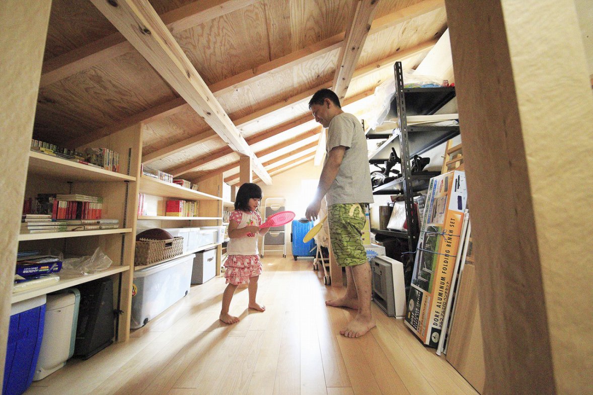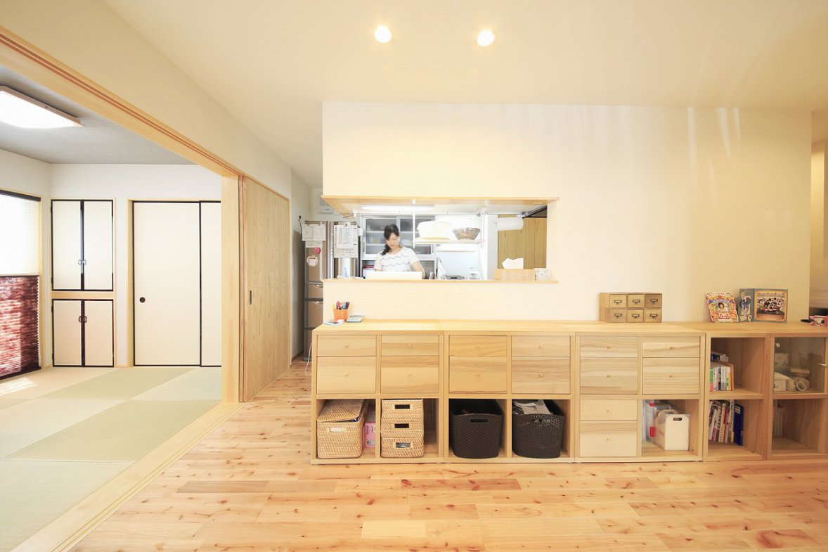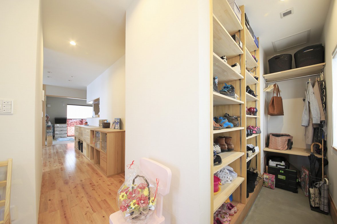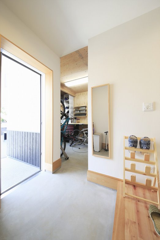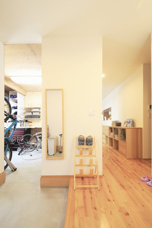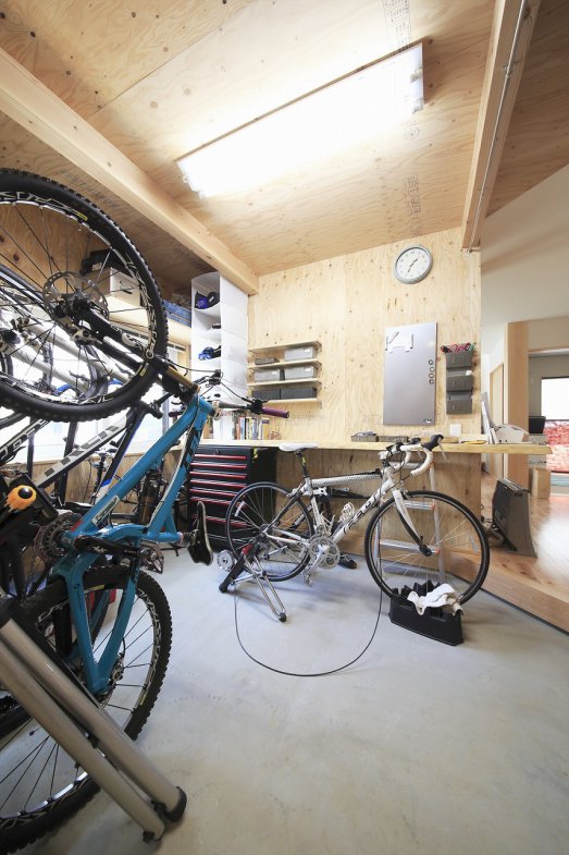 ご夫婦のこだわりの趣味スペースとして、リビング隣にサイクルガレージ兼メンテナンス室を設置。リビングから自転車を眺めながら趣味の時間を過ごすことが楽しみだとお話いただきました。キッチンはリビング・和室・吹き抜けを通して2階まで見渡せる配置に。奥のパントリーからは洗面室・玄関・リビングへ回遊できる便利な動線も備え、家事のしやすさと趣味の時間、両方を両立させた住まいになっています。