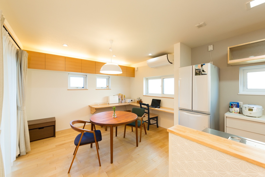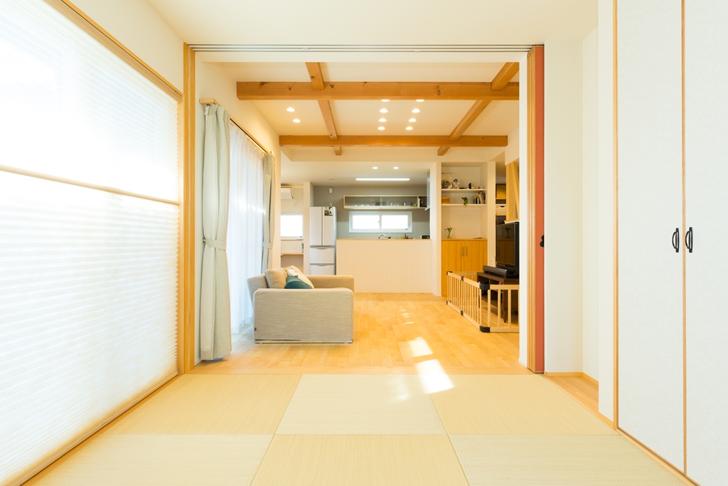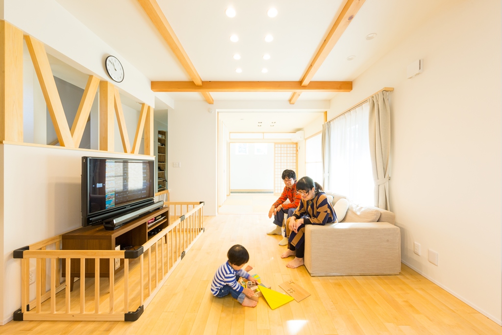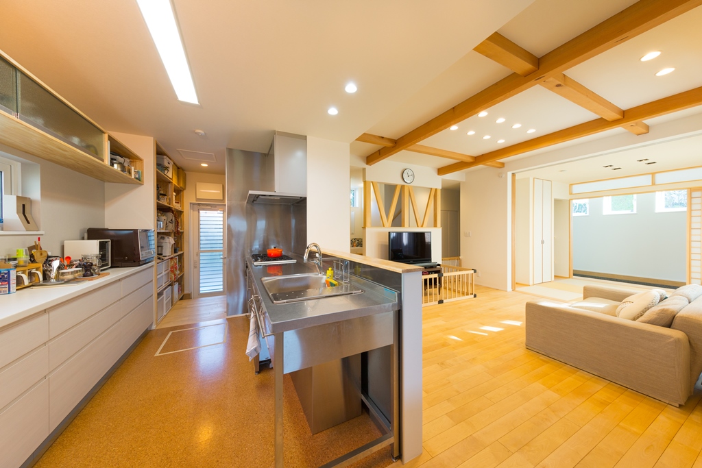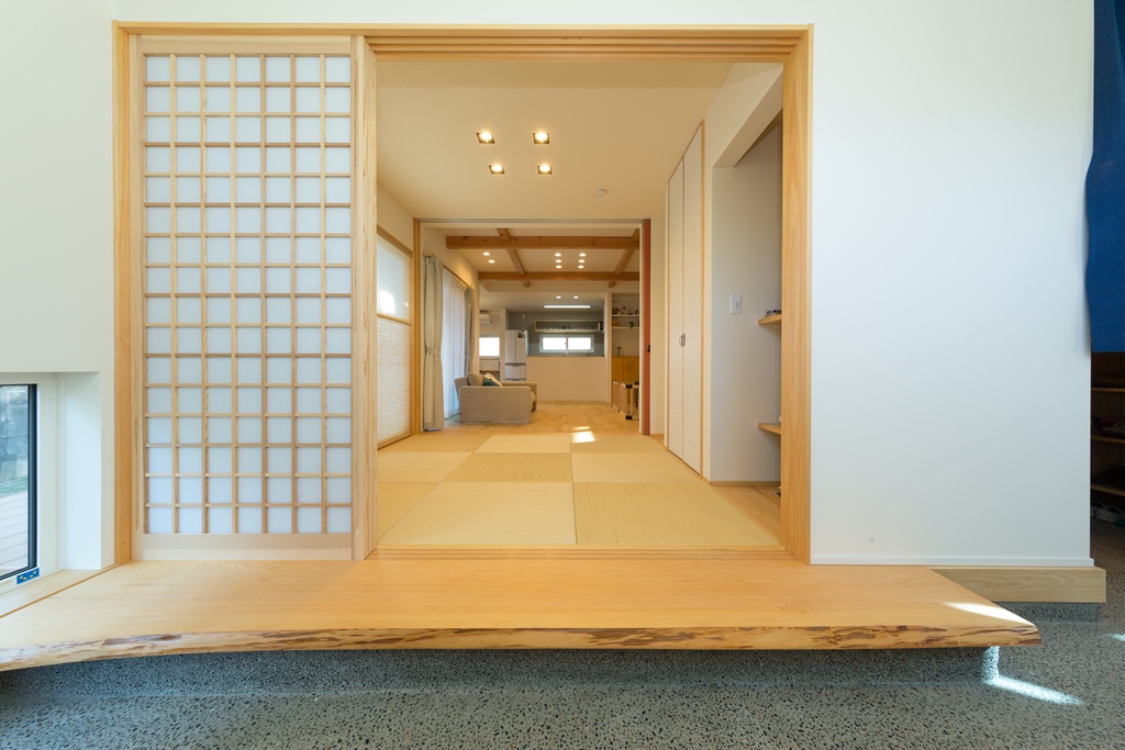 土間からはお客様を迎える和室へとつながり、右手の入り口は家族専用。廊下を通って水まわりへと回遊できる便利な動線が暮らしを支えます。リビングの床にはカバザクラの無垢材、壁には珪藻土を採用し、自然素材に包まれた心地よい空間に。テレビ背面の壁は上部を抜き、階段の上り下りが感じられるように筋交いをあえて見せるデザインとしました。また、リビングと和室を仕切る三枚引戸は、西川材の杉で造作。木の美しさを存分に楽しめます。こだわりのステンレスキッチンからは、1階全体を見渡せ、家族とのつながりを大切にできる間取りとなっています。
