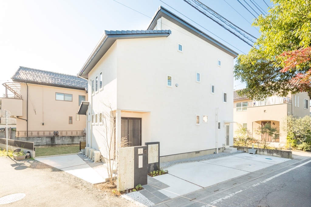 外観は白い塗り壁に瓦屋根を合わせた和モダンスタイル。ウッドデッキの横には小さな坪庭も設けられ、外と内をやさしくつなげています。