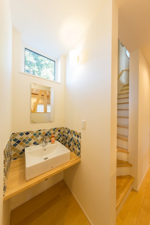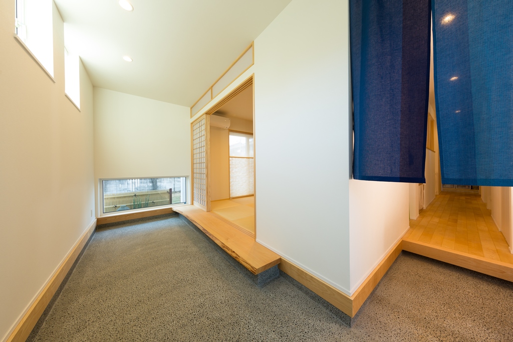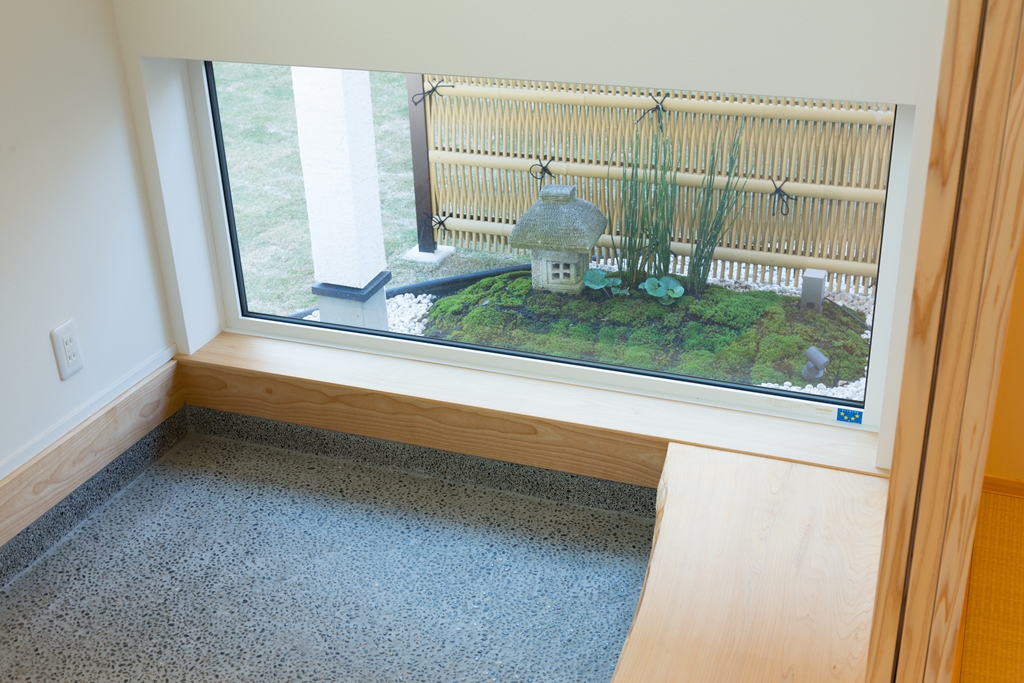 K様が思い描いていたのは、広々とした土間玄関。正面には地窓を設け、四季の変化を楽しめる坪庭が広がります。道路に面した左側の窓は高い位置に配置し、プライバシーを守りながら光を取り入れる工夫も。