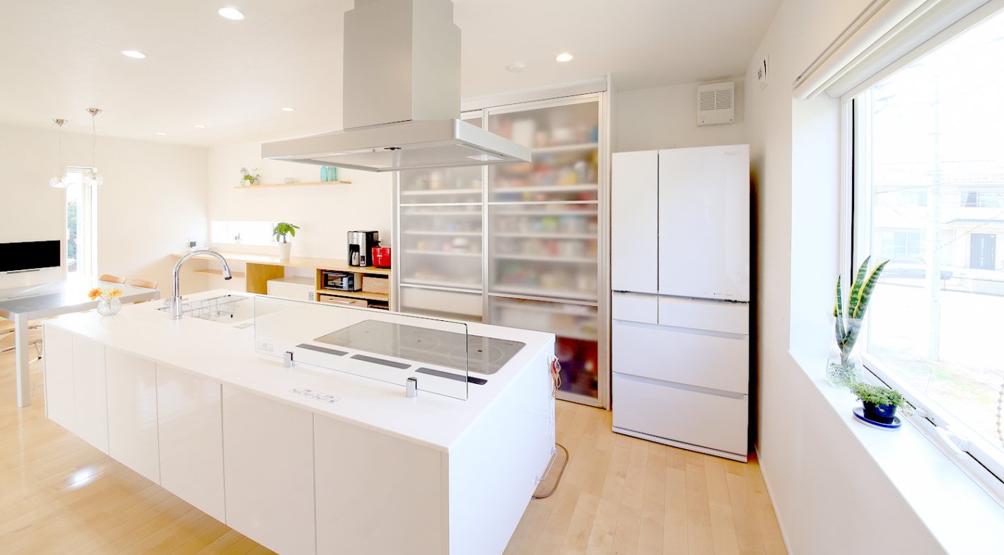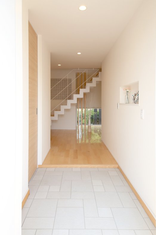 毎日使う玄関が、いつでもスッキリ片付いて気持ちいい。地窓から見える緑が、家に自然な彩りをそえてくれます。