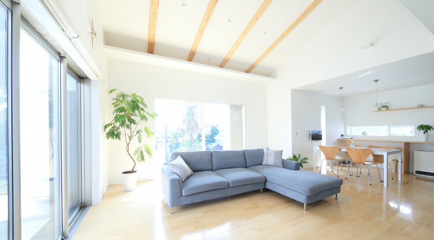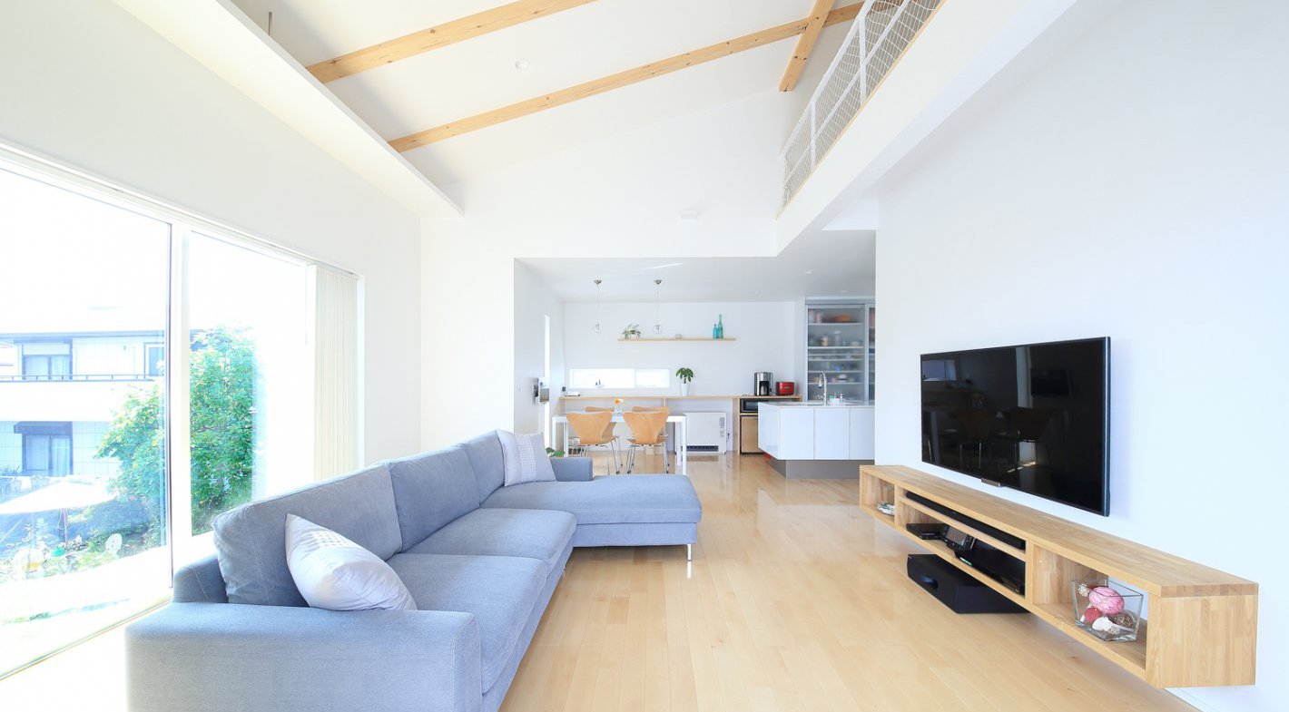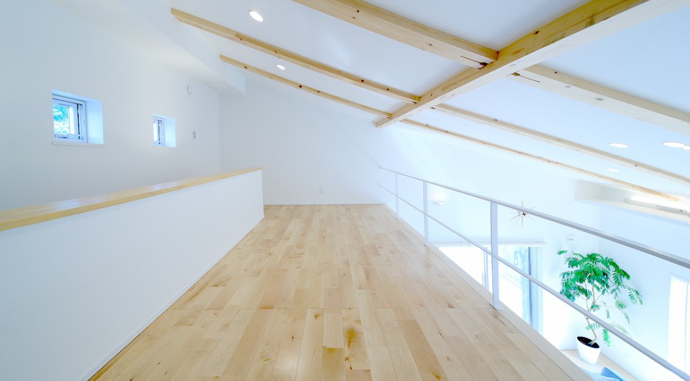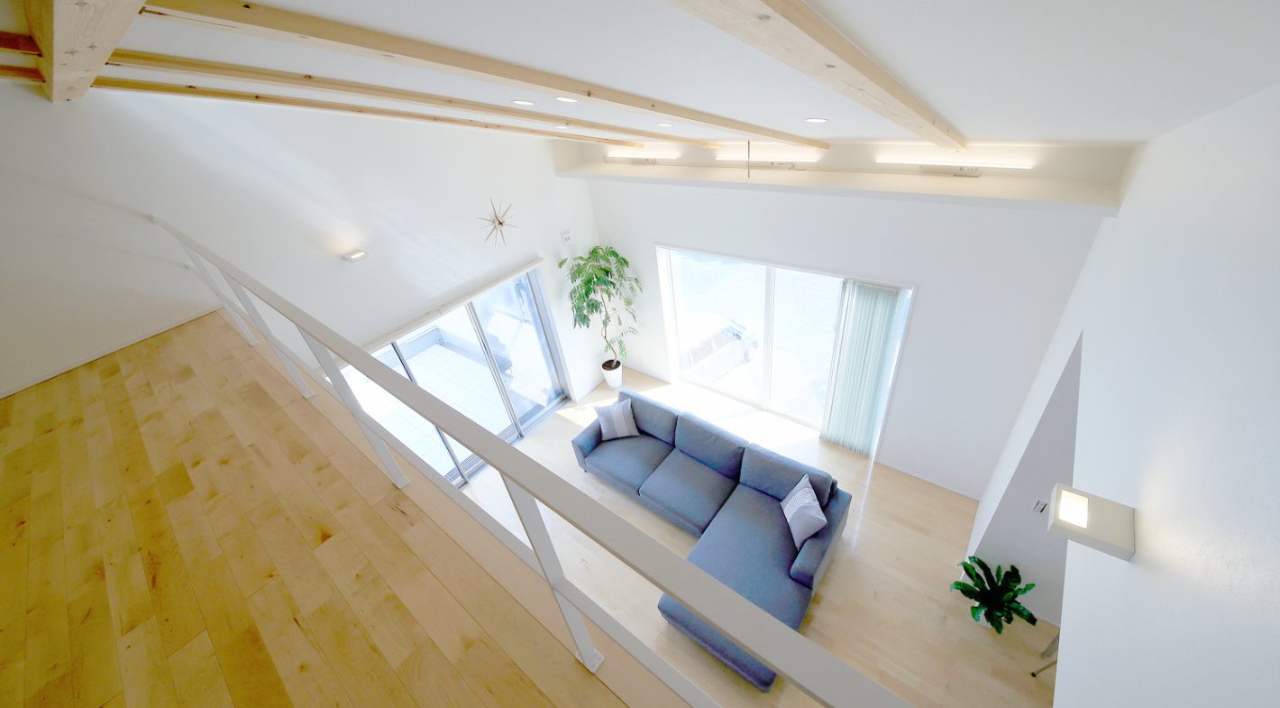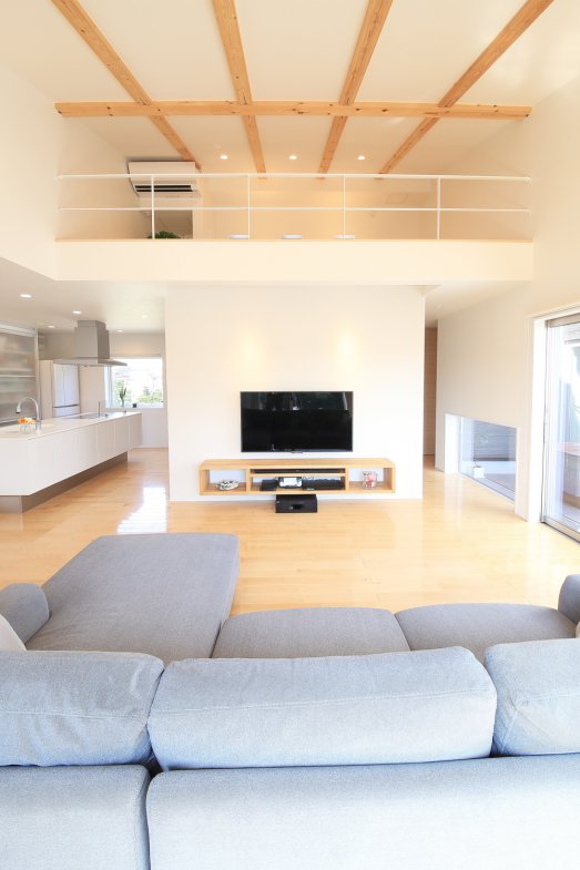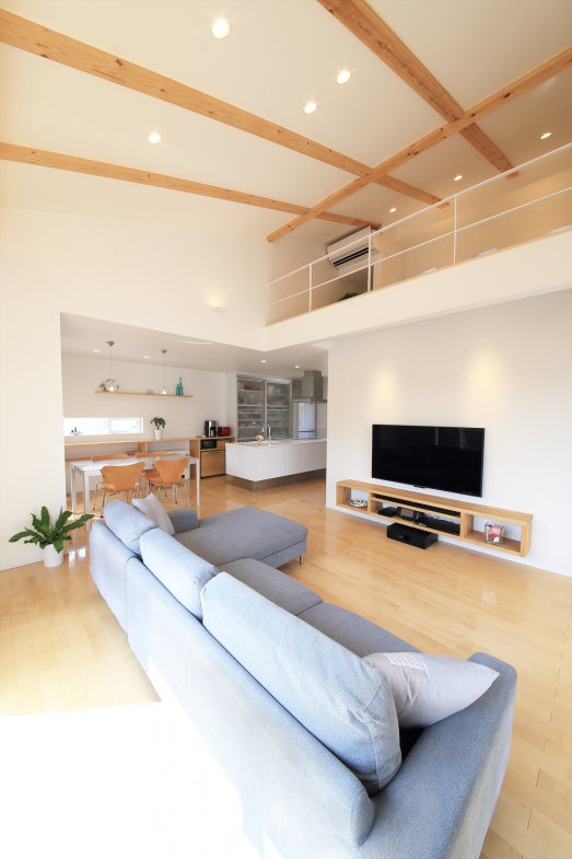 2階リビングは間仕切りのない大空間。明るく開放的で、横の広がりだけでなく、勾配天井の吹き抜けが小屋裏までつながる縦の広がりも魅力です。床には明るいサクラの無垢材を使い、素足で歩くとほっと心地よい感触。