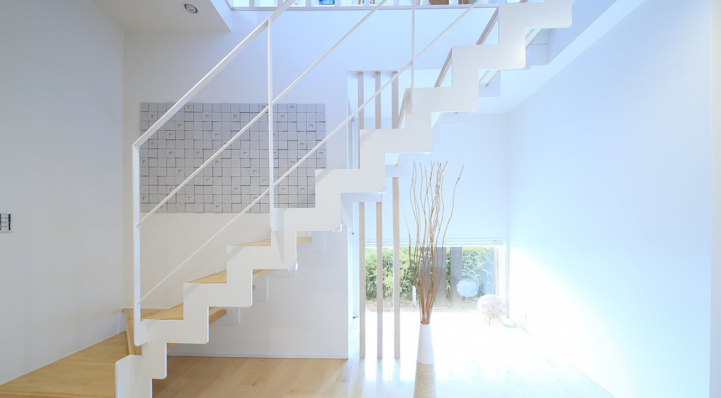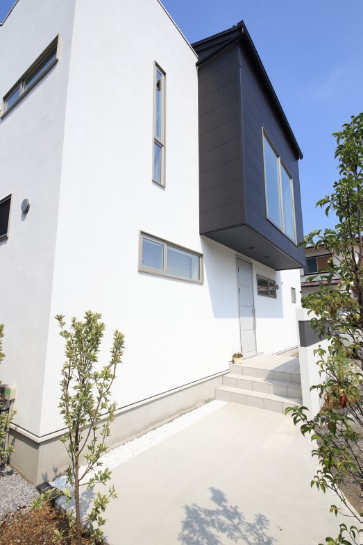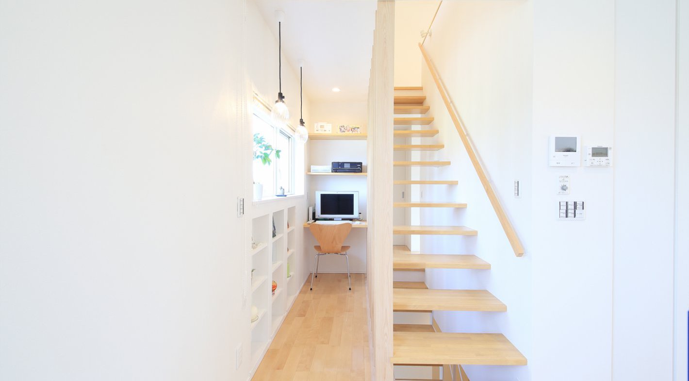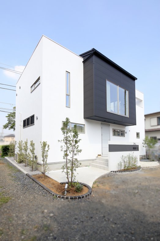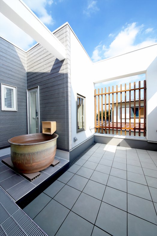 スケルトンの鉄骨階段のそばには、窓の外の景色を眺めながら作業できる書斎スペースも設置。自分だけの時間を楽しめます。そして2階バルコニーには、夢だった益子焼の露天風呂を。外からの視線にも配慮して、ベストな場所に設置しました。白と黒でまとめたスタイリッシュなフォルム。数々の施工例を参考に、家族のこだわりを詰め込んだマイホームです。