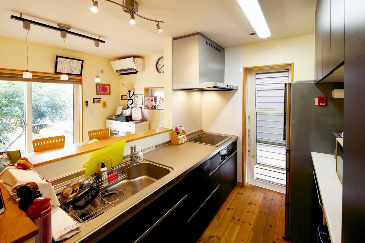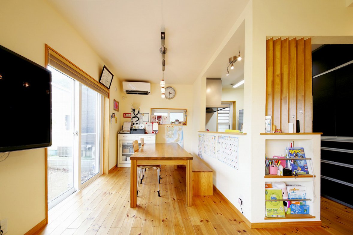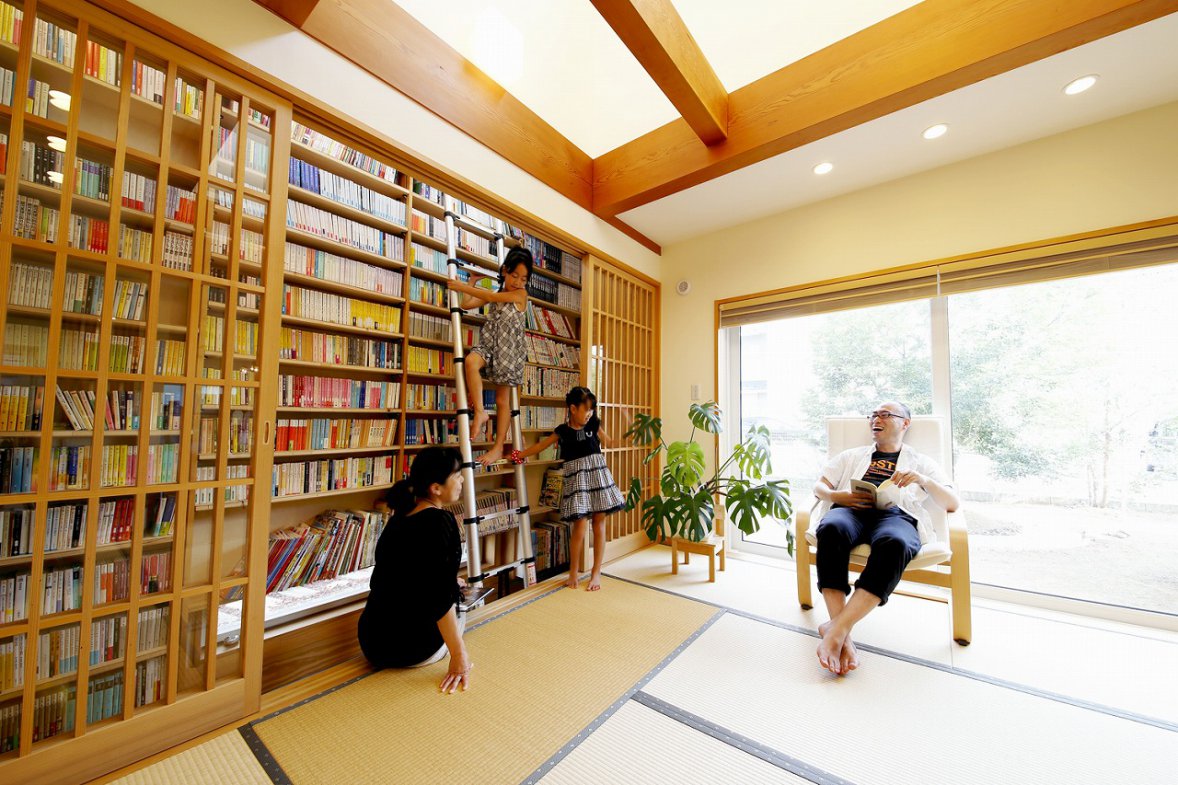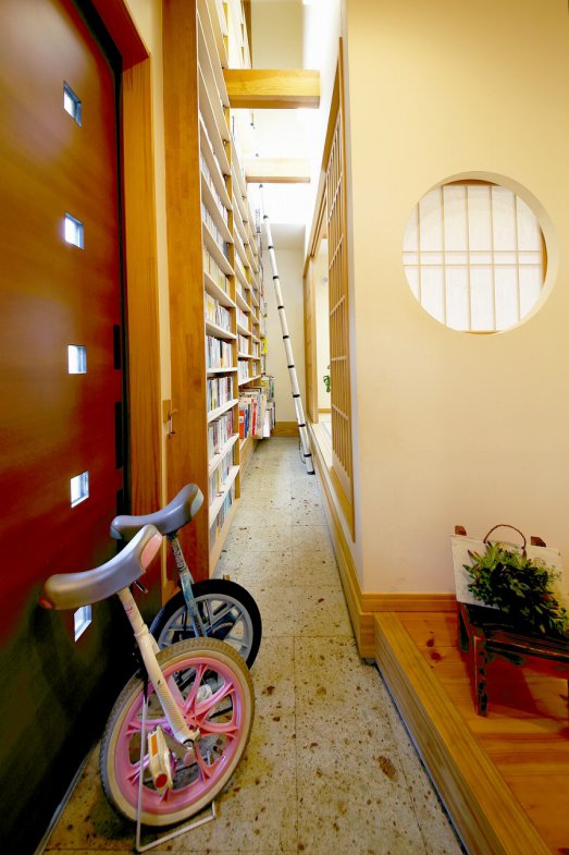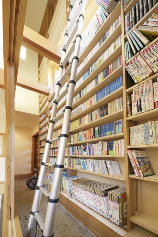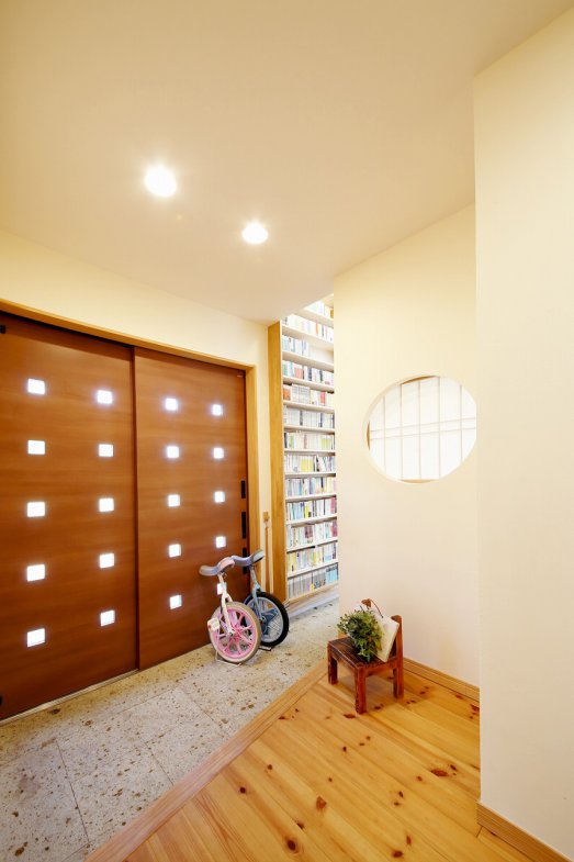 土間の壁一面から2階まで、本好きなIさんの蔵書をたっぷり収納できるこだわりの本棚を設置。玄関から和室につながる土間スペースは、吹き抜けを通して空間の広がりを楽しめます。外観は緑豊かな周囲の環境になじむシンプルなデザインで、外壁は自然素材の塗り壁仕上げ。落ち着いた印象と木の温もりが感じられる住宅です。