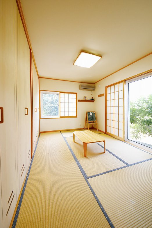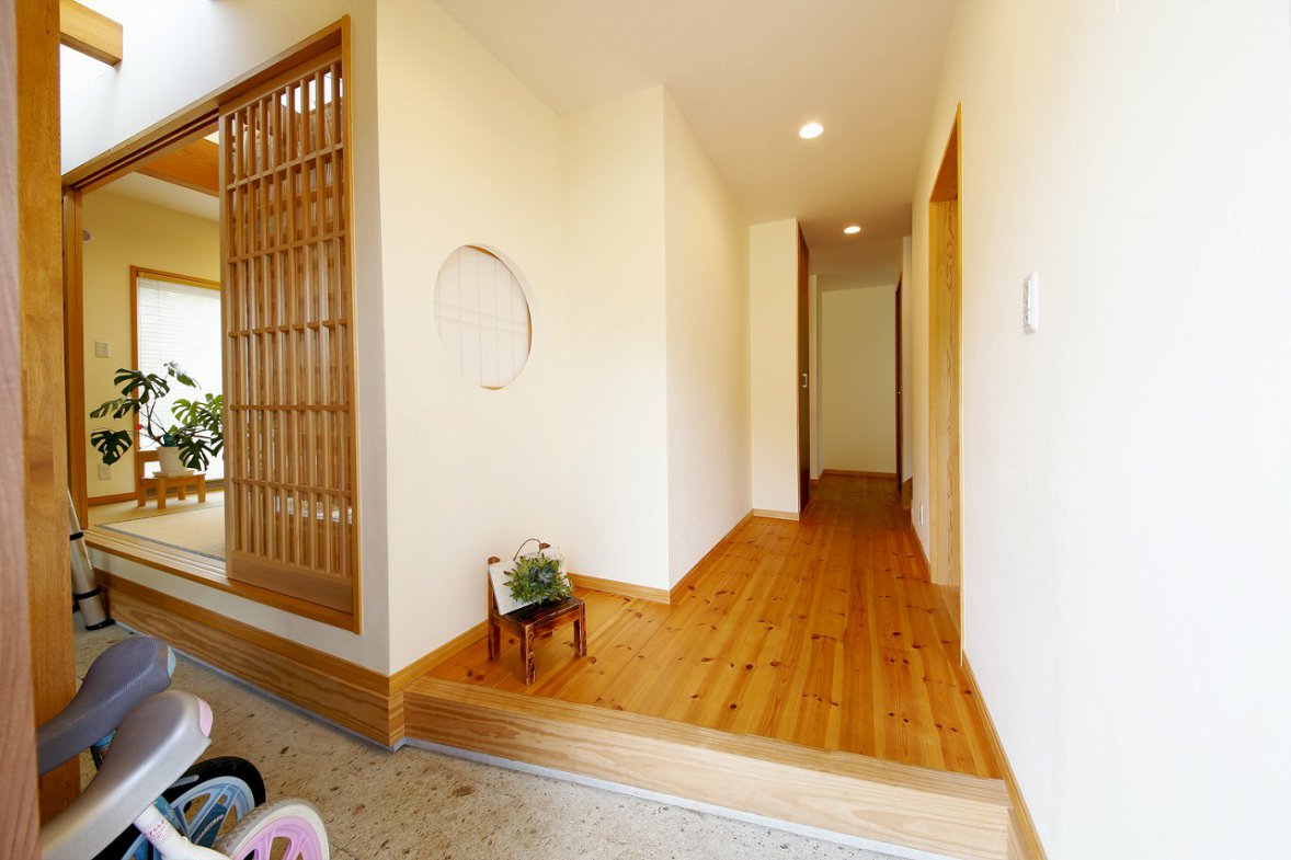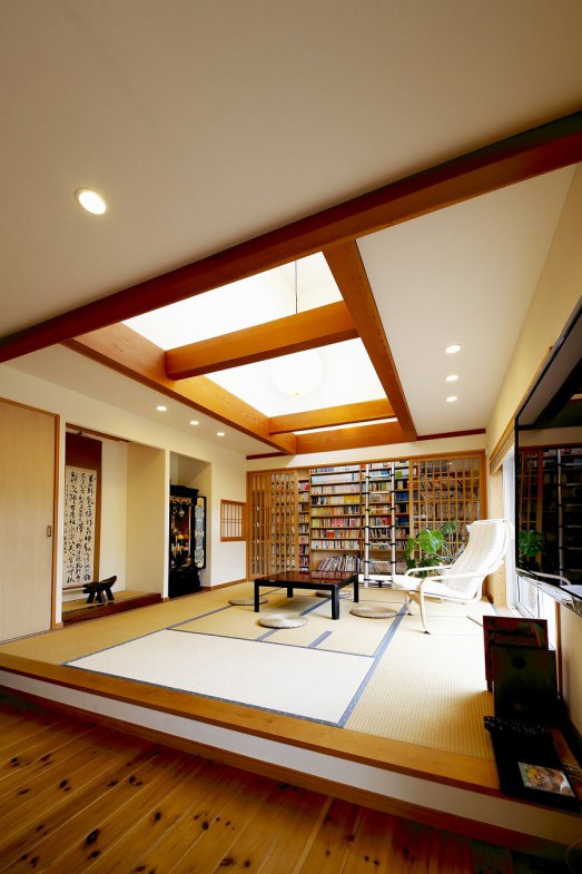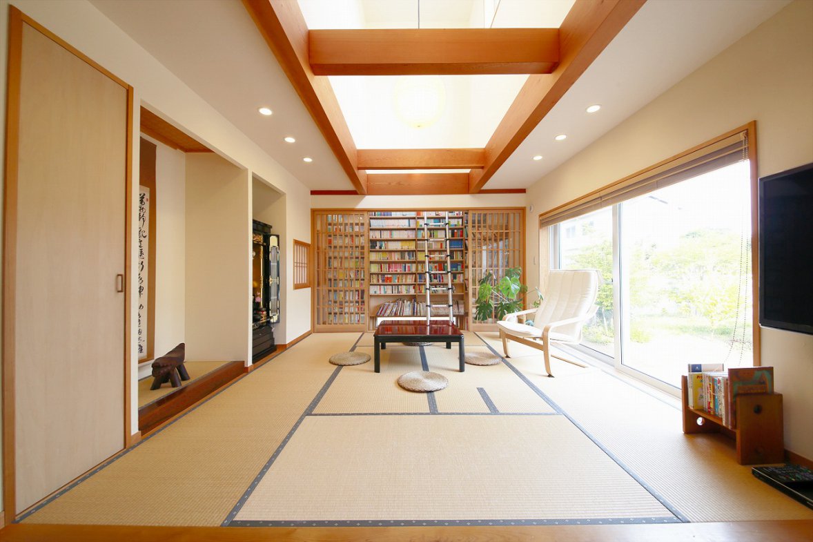 1階のリビング兼和室は、お母様がお茶をたてることもあるため、隣のダイニングから1段上げた特別な空間になっています。大きな吹き抜けと、ウッドデッキに面した南側の窓から、一日中明るい光が差し込み、開放感あふれる空間です。土間スペースとは格子の建具で緩やかにゾーニング。仕切りのない空間や吹き抜けも、外断熱と二重通気のソーラーサーキット構法により快適に過ごせます。