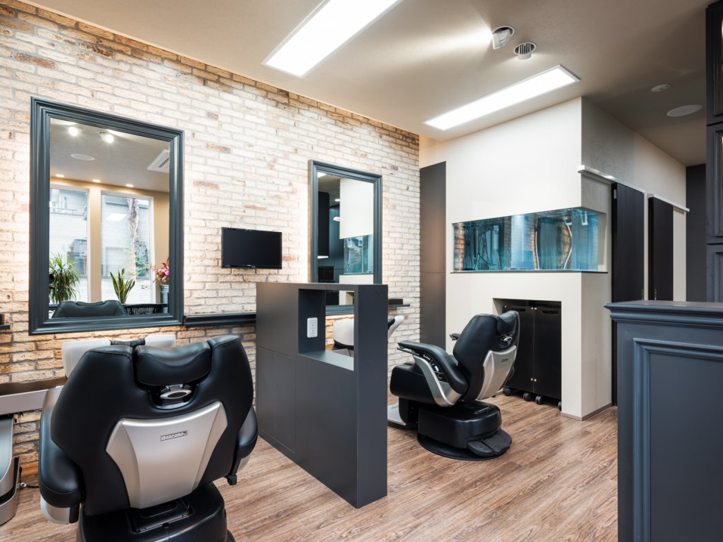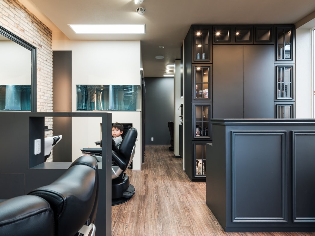 設計では、S様の頭の中にあるイメージやデザインの希望を思い浮かぶままにお聞きし、設計担当が具体案として提案。ご近所では唯一無二でありながら、若々しくなりすぎず、どの年代にも好まれるバーバーを目指しました。美容室ではなく“バーバースタイル”にこだわり、アンティーク調やビンテージ感を大切に演出。さらに、個室を設けて特別感を出すとともに、子どもの頃からの夢であった魚が泳ぐ水槽も実現しました。