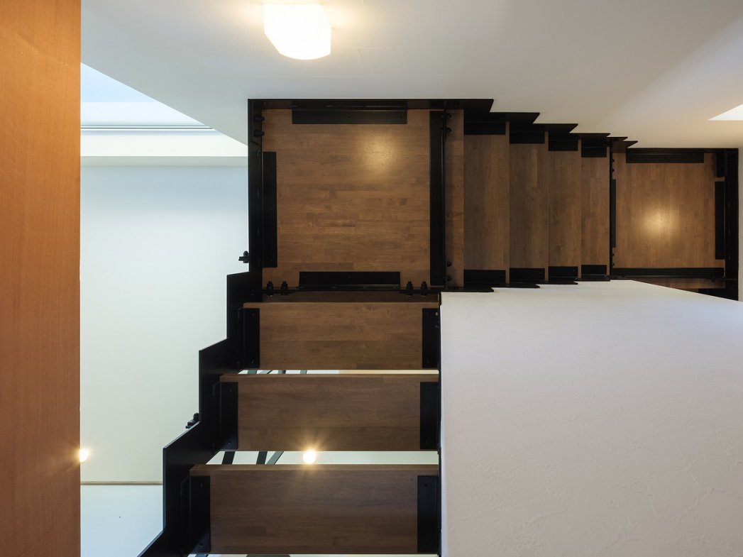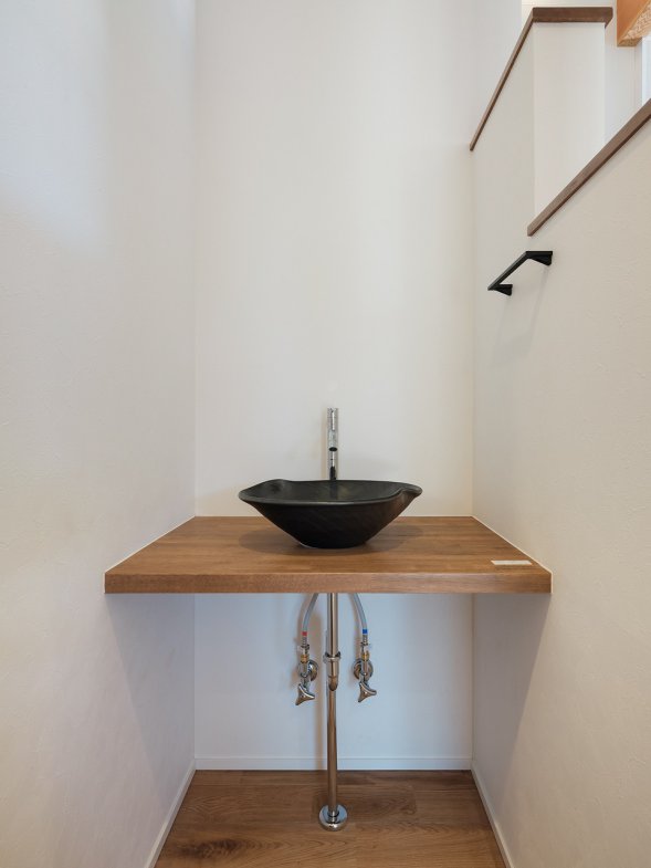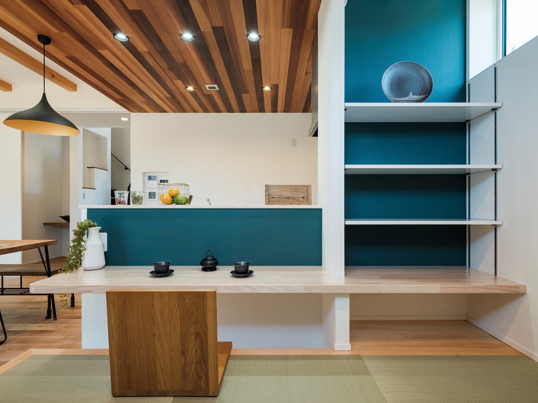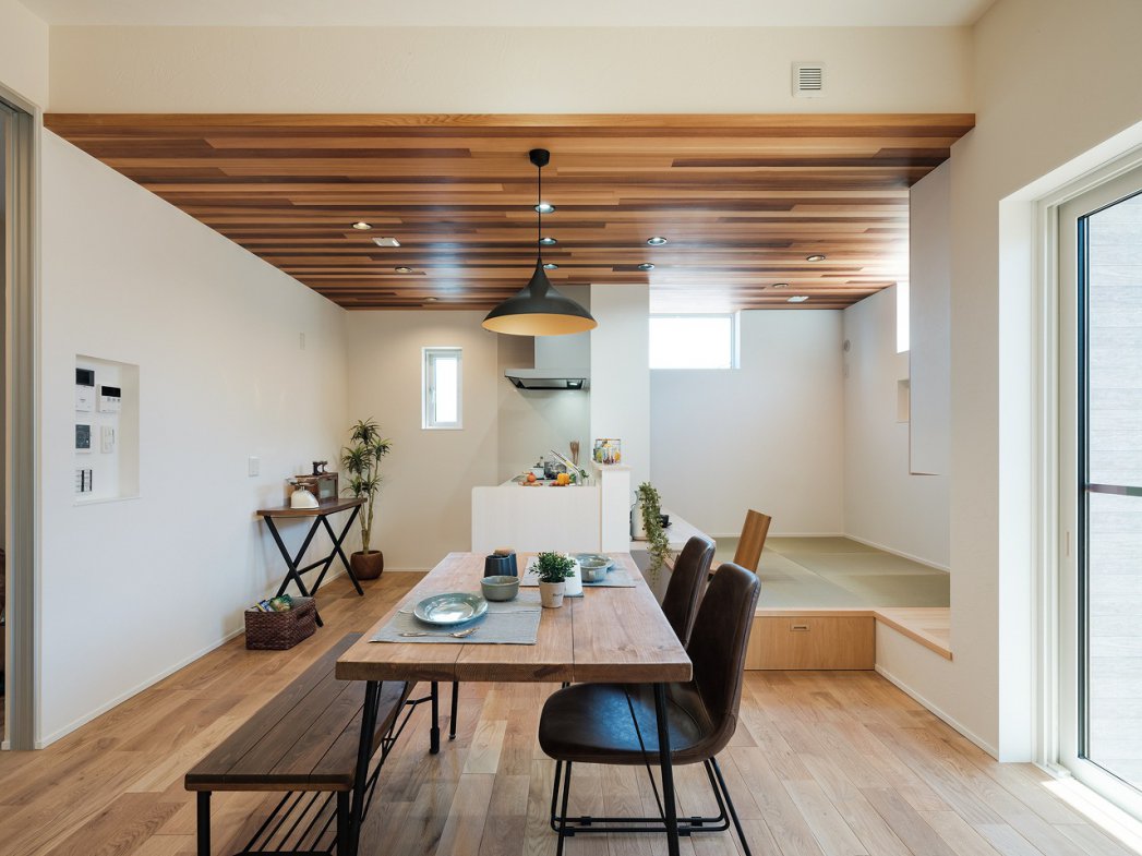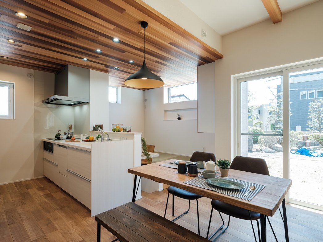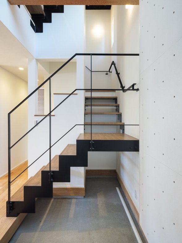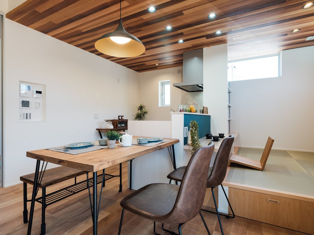 玄関に足を踏み入れると、圧巻の吹き抜け空間が広がります。シャープな鉄骨と壁のボルダリングはモノトーンで統一され、シックで洗練された雰囲気を演出。高い位置の窓は空だけが見えるように設計され、奥様お気に入りのハイセンスな照明が空間を彩ります。家に入って見えるすべてがこだわりの詰まった玄関です。ボルダリングで遊ぶお子様の姿を見守れるよう、LDKとの仕切りにはガラス戸を採用。キッチンとダイニングは横並びに配置し、家族のどこにいても顔を合わせられる設計としました。