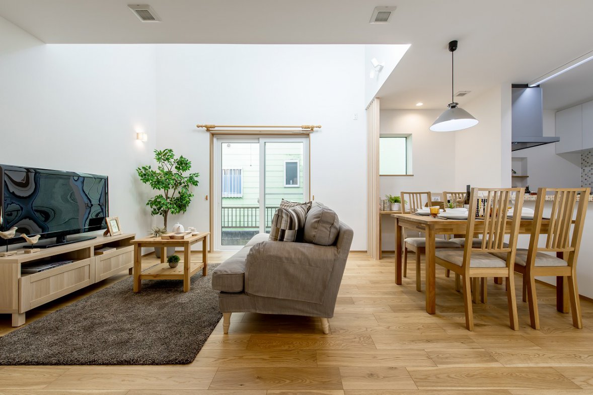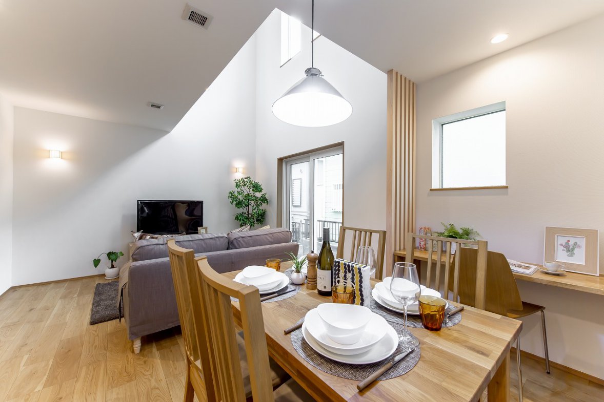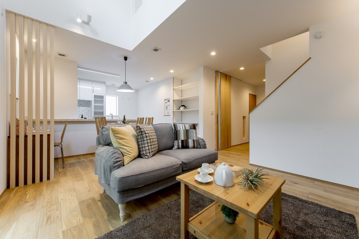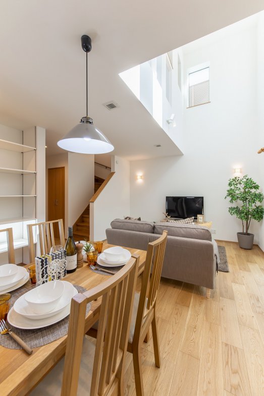 採光豊かな吹き抜けが、家族が集まる1階をいつでも明るく心地よい空間にしてくれます。将来的な可変性にも配慮し、効率的な子育てプランを採用。小さなお子さまと愛犬と暮らす住まいは、外断熱・二重通気の魅力を活かしながら、自然と家族が集まれるリビングを中心に設計しました。2階にはフリースペースを設け、可動式の間仕切りを用意。