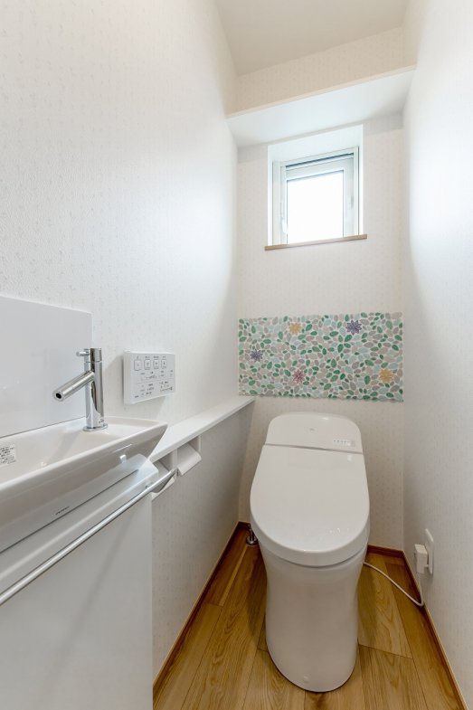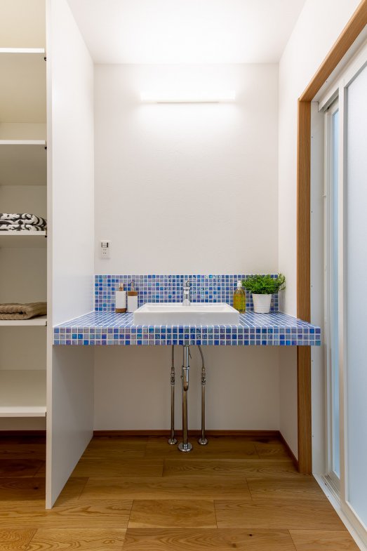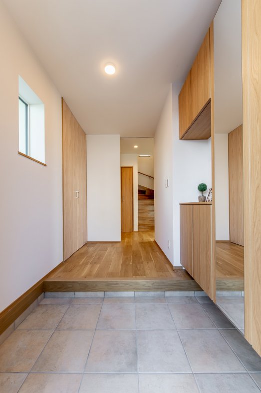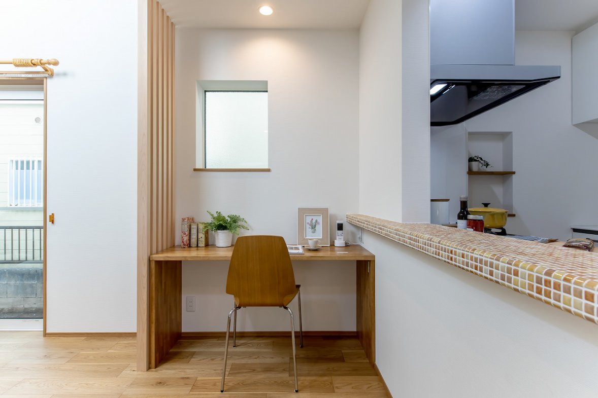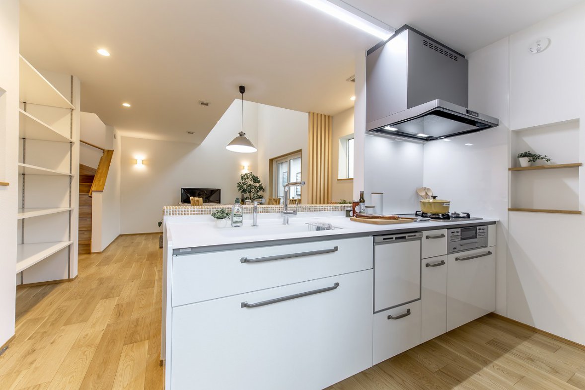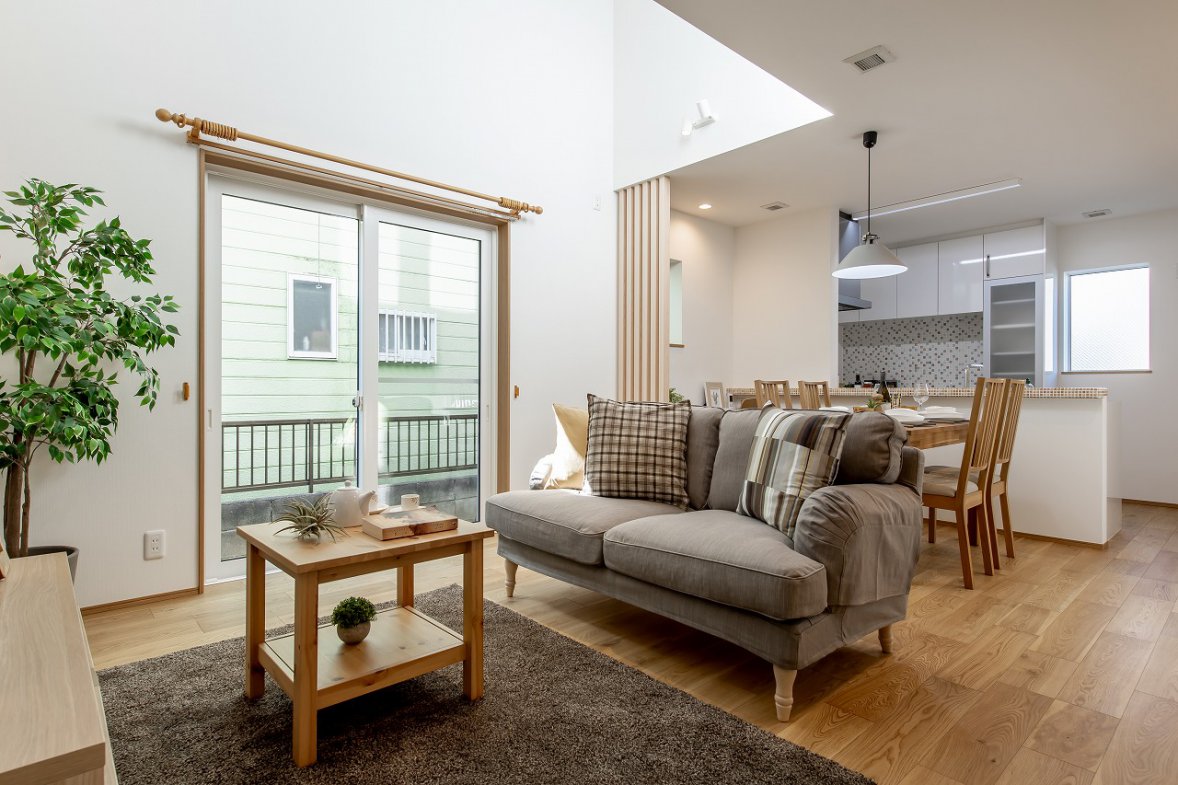 採光豊かな吹き抜けが、家族が集まる1階をいつでも明るく心地よい空間にしてくれます。将来的な可変性にも配慮し、効率的な子育てプランを採用。小さなお子さまと愛犬と暮らす住まいは、外断熱・二重通気の魅力を活かしながら、自然と家族が集まれるリビングを中心に設計しました。2階にはフリースペースを設け、可動式の間仕切りを用意。