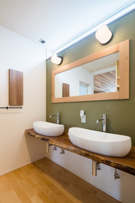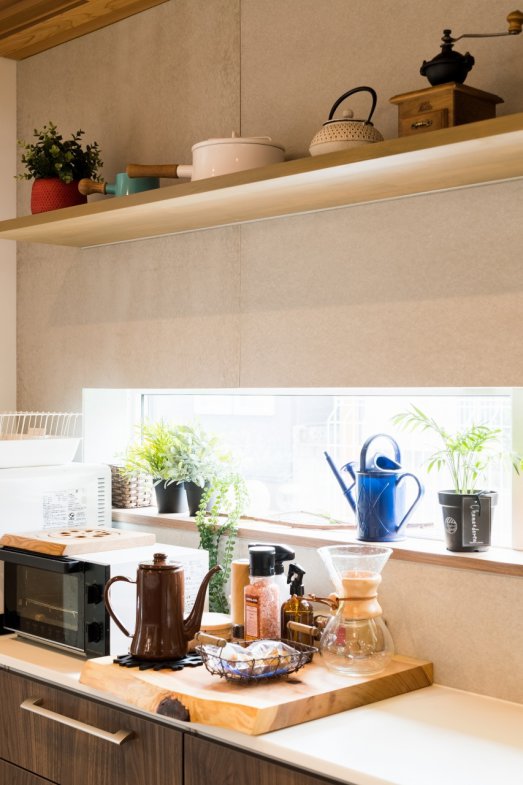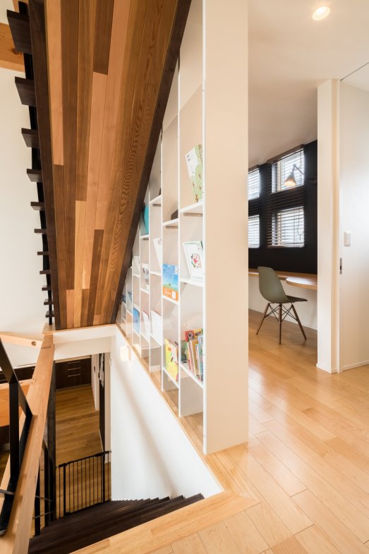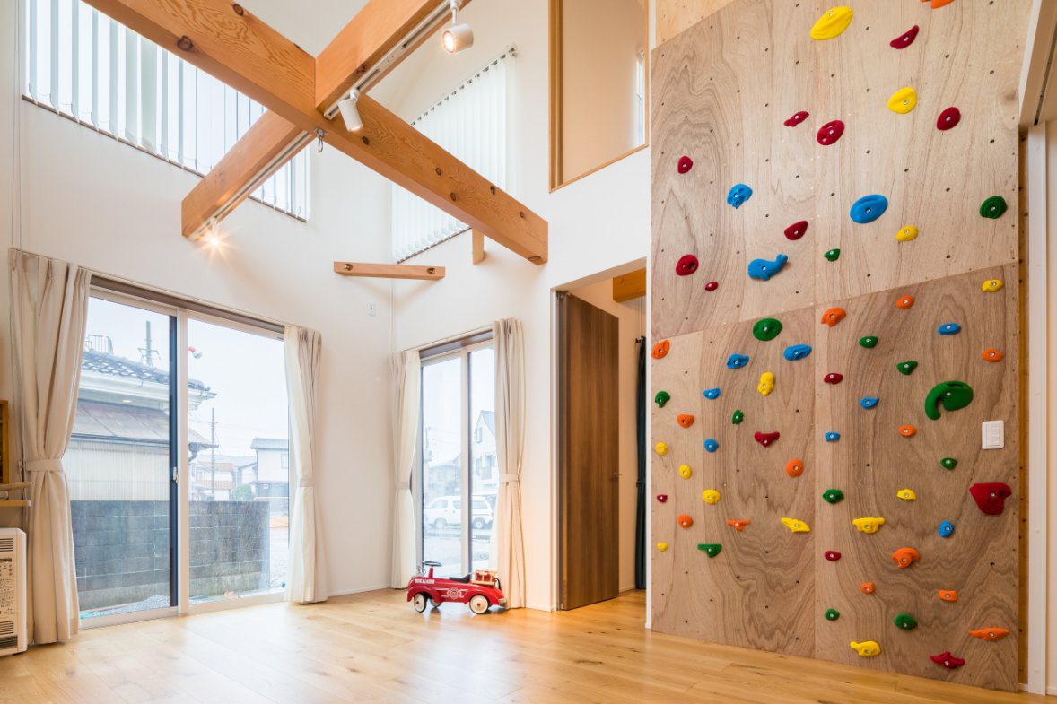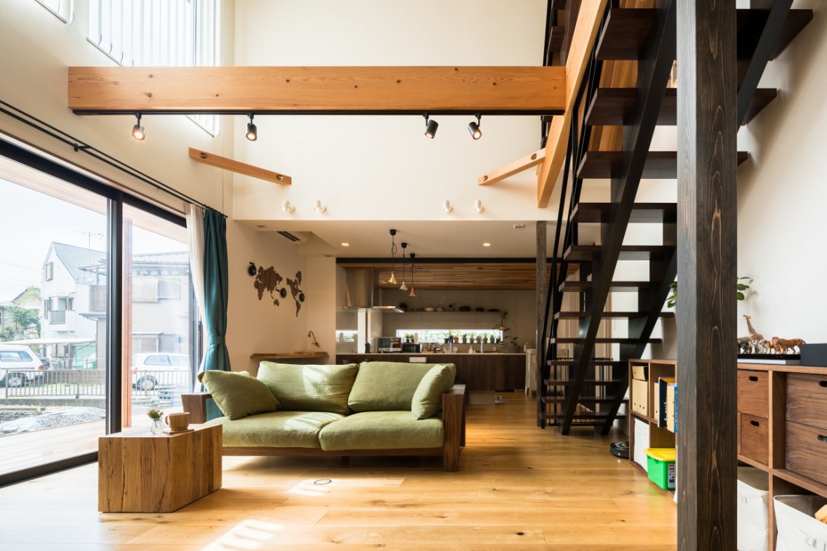 踏み板はブラックウォールナット調を採用し、譲れなかった鉄骨階段へのこだわりを実現。吹き抜けと一体化した階段が美しいアクセントとなり、どこにいても家族の気配がわかる圧倒的な大空間のLDKが生まれました。リビングにはボルダリングウォールを設け、お子様たちも大満足。ソファやテーブル、オープン棚など、お気に入りのアイテムでコーディネートされた空間は、ご家族の個性を映し出す心地よい場となっています。床材と窓枠のコントラストを意識した素材選びによって、統一感のある洗練された住まいが完成しました。